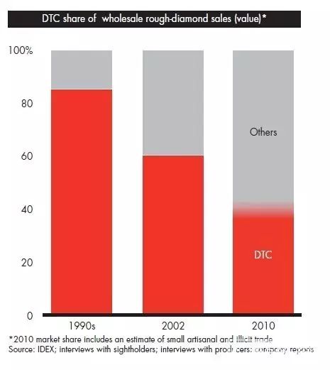 儲(chǔ)備足夠人類幾千年的用量, De Beers還想用老套路,但礦坑有國家行為的干預(yù), De Beers也無計(jì)可施。 直接導(dǎo)致其市場份額從 90%下降到50%。